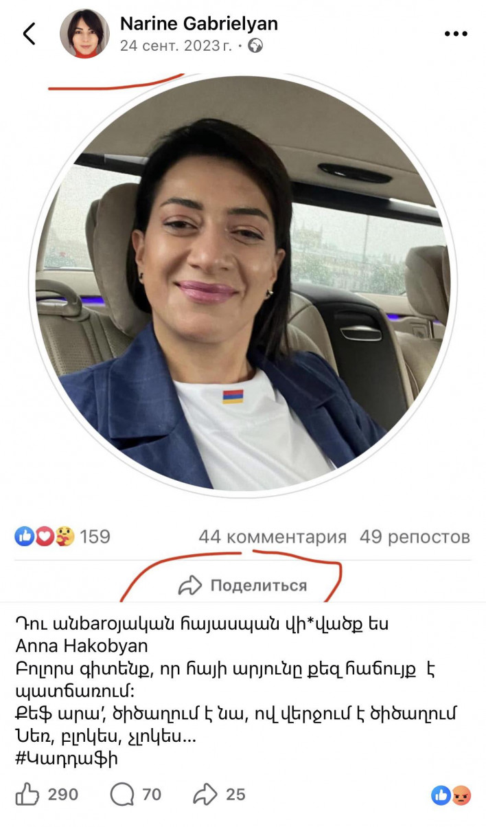Հիշեցնեմ՝ այս ուրախ եր-ա- խը տեղադրել էիր Արցախի ցեղասպանության սկսման հենց հաջորդ օրը։ Թե բա՝ հորինված կերպարներ էին։ Բոլոր աղետների օրերին քո հայասպան կերպարները հիշում ենք, ու օրը գալու է՝ քեզ էլ, քո չամուսնուն էլ, հիշեցնելու ենք։ Մեր գլխի բերած աղտեների համար էլ պատասխան տալու ես դրա հետ հավասար