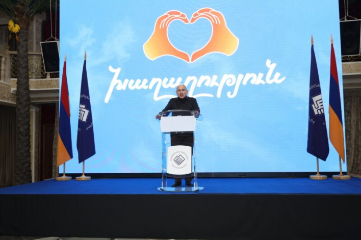 Խոսքը կապույտ ֆոնին գրված ընդամենը մեկ բառի՝ «Խաղաղության» մասին է, որի տակ Փաշինյանի մատներով ցուցադրվող սրտիկ նշանն է նկարված։