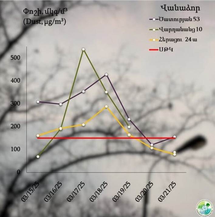 Հիդրոօդերևութաբանության և մոնիթորինգի կենտրոնԸ ներկայացրել է քաղաքների մթնոլորտային օդում փոշու պարունակությունը մարտի 14-20-ը։ Մթնոլորտային օդում փոշու պարունակությունը գերազանցել է սահմանային թույլատրելի կոնցենտրացիան.