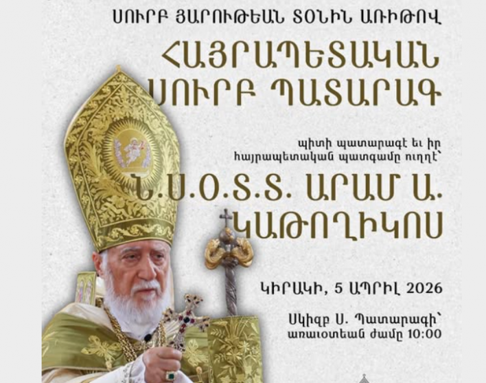 «Կիրակի, 5 Ապրիլ 2026-ին, մեր Տիրոջ եւ Փրկիչին հրաշափառ Յարութեան տօնին առիթով, Անթիլիասի Մայրավանքի Սուրբ Գրիգոր Լուսաւորիչ Մայր Տաճարին մէջ պիտի պատարագէ եւ իր հայրապետական պատգամը ուղղէ