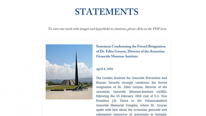 Լեմկինի անվան ցեղասպանության կանխարգելման և մարդկային անվտանգության ինստիտուտը խստորեն դատապարտում է Հայոց ցեղասպանության թանգարան-ինստիտուտի (ՀՑԹԻ) տնօրեն, դոկտոր Էդիտա Գզոյանի հարկադիր հրաժարականը, որը տեղի է ունեցել ԱՄՆ փոխնախագահ Ջ.Դ. Վենսի 2026 թվականի փետրվարի 10-ին Ծիծեռնակաբերդի հուշահամալիր կատարած այցից հետո, որտեղ դոկտոր Գզոյանը նրա հետ խոսել է հայոց ցեղասպանության և հետագա 1980-ականների վերջին Սումգայիթում, Կիրովաբադում և Բաքվում հայերի կոտորածների մասին: Այցի շրջանակներում դոկտոր Գզոյանը փոխնախագահին նվիրել է հայոց ցեղասպանության մասին չորս գիրք: