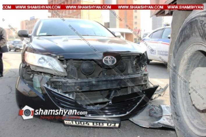 Ավտովթար Երևանում. «Մետրոպոլ» հյուրանոցի դիմաց ՀՀ Պետեկամուտների կոմիտեի Հարկային ծառայության աշխատակազմի ղեկավարի Toyota-ն բախվել է КамАЗ-ին. տեսանյութ
