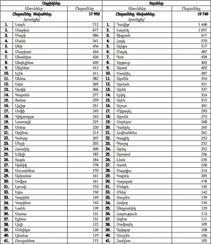 ՀՀ ազգային վիճագրական ծառայությունը ներկայացրել է 2017 թվականին Հայաստանում նորածիններին տրված ամենատարածված անունները: Ցուցակը գլխավորել են Նարե (712) և Դավիթ (1148) անունները: Աղջիկների ամենատարածված անունների ցանկում են ներառվել նաև Մարիա (677), Մարի (586), Մանե (541) և Անի (456) անունները. Տղաների ամենատարածված անունների ցանկում են ներառվել Նարեկ (1 057), Տիգրան (617), Հայկ (570), Ալեքս (517) անունները: