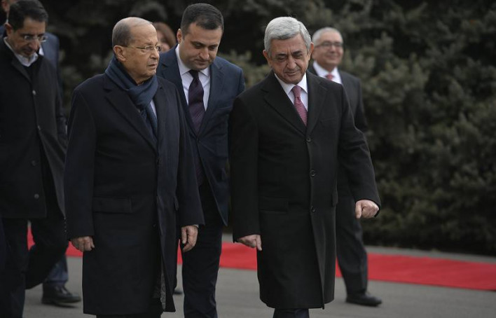 Հանրապետության Նախագահի նստավայրում այսօր տեղի է ունեցել պաշտոնական այցով Հայաստանի Հանրապետություն ժամանած Լիբանանի Հանրապետության նախագահ Միշել Աունի դիմավորման պաշտոնական արարողությունը, որին հաջորդել է Հայաստանի և Լիբանանի նախագահների հանդիպումը նեղ կազմով: «Հարգելի՛ պարոն նախագահ, ես մեծ ջերմությամբ և սիրով ողջունում եմ Ձեզ Հայաստանի Հանրապետությունում: Մեզ համար մեծ ուրախություն և պատիվ է հյուրընկալել բարեկամ Լիբանանի նախագահին Հայաստանում, և մենք խորապես շահագրգռված ենք Լիբանանի հետ մեր հարաբերությունները խորացնելու բոլոր ոլորտներում: Ես մեծ ջերմությամբ եմ հիշում իմ այցը Լիբանան դեռևս 2012 թվականին, որը լավ խթան հանդիսացավ մեր հարաբերությունների զարգացման գործում: Վստահ եմ, որ Ձեր այցը նոր էջ է բացելու մեր հարաբերություններում: Մեր միջպետական հարաբերություններն ընդամենը 25 տարվա պատմություն ունեն, բայց մեր ժողովուրդների բարեկամությունը դարեր է հաշվվում: Իհարկե, մեր երկու ժողովուրդների բարեկամության ամրապնդման գործում շատ մեծ դերակատարություն ունի հայ համայնքը: Մենք խորապես շնորհակալ ենք Լիբանանի ժողովրդին և իշխանություններին մեր հայրենակիցների նկատմամբ ցուցաբերված հոգատար վերաբերմունքի համար: Նրանք ժամանակի ընթացքում դարձան Լիբանանի լիարժեք քաղաքացիներ՝ պահելով իրենց ազգային ինքնությունը: Եվ, իհարկե, մենք շնորհակալ ենք Լիբանանի իշխանություններին, այդ թվում՝ խորհրդարանին, Հայոց ցեղասպանության փաստը ճանաչելու համար: Սա շատ կարևոր ներդրում է: Պարո՛ն նախագահ, բարով եք եկել: Ես շատ ուրախ եմ ողջունելու Ձեզ Երևանում»,-ասել է Նախագահ Սերժ Սարգսյանը: Նախագահ Միշել Աունը շնորհակալություն է հայտնել Հանրապետության Նախագահին հրավերի համար և իր համար մեծ պատիվ համարել Հայաստանի Հանրապետություն այցելելը: «2012թ. Լիբանան Ձեր այցի ժամանակ Ձեր պատվին կազմակերպված ճաշի ընթացքում ինքս մասնակցել եմ, և այդ ժամանակ մենք մի կարճատև զրույց ենք ունեցել: Ես շատ ուրախ եմ, որ գտնվում եմ Հայաստանի Հանրապետությունում: Այո՛, Լիբանանի հայ համայնքի ներկայացուցիչներ կան իմ պատվիրակության կազմում` զբոսաշրջության նախարարը, նաև Դաշնակցություն կուսակցության ղեկավարը՝ պատգամավոր պարոն Բագրատունյանը: Ձե՛րդ Գերազանցություն, պետք է ասեմ, որ հայ համայնքը մեծ ներդրում է ունեցել Լիբանանի զարգացման, ծաղկման գործում: Նրանք բավականին լուրջ են աշխատում իրենց գործունեության բոլոր բնագավառներում, պատասխանատու օղակներում: Մենք ինքներս շատ ենք հենվում նրանց վրա բոլոր բնագավառներում: Մենք լայն հասարակություն ենք, և հայ համայնքը կարողացել է իր մշակույթն ու ինքնությունը պահպանել Լիբանանում: Իհարկե, շատ կարևորում ենք և հպարտ ենք այդ բազմակարծությամբ ու մշակութային բազմազանությամբ, որովհետև մենք կարողանում ենք դրանցից բավական օգտվել և զարգացնել Լիբանանը: Այցս միտված է ավելի ամրապնդելու Հայաստանի և Լիբանանի միջև հարաբերությունները: Հույս ունենք, որ Հայաստանի և Լիբանանի միջև այդ հարաբերությունները շատ ավելի կընդլայնվեն և կխորանան: Բազմաթիվ բնագավառներ կան, որոնց ուղղությամբ կարող ենք աշխատել, և դա կլինի ի բարօրություն մեր երկու երկրների»,- Նախագահ Սերժ Սարգսյանի հետ հանդիպմանն ասել է նախագահ Միշել Աունը: