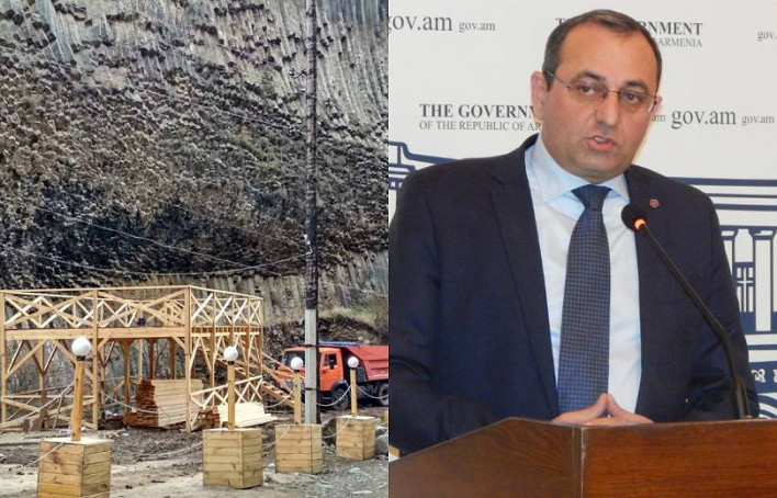 Բնապահպանության նախարար Արծվիկ Մինասյանն այսօր լրագրողների հետ զրույցում ասաց, որ Գառնիի քարերի սիմֆոնիայում շինարարությունը կասեցված է: «Երեկվանից քայլեր են ձեռնարկվում, այնտեղ կասեցված է որևէ գործողություն շինարարության տեսքով մինչև հստակ պարզվեն բոլոր հիմքերը»,- ասաց նա: Նախարարի խոսքով, քարերի սիմֆոնիան կամ բազալտե երգեհոնը համարվում է բնության հուշարձան եւ ընդամենը մի քանի ամիս առաջ են հաստատվել այս հուշարձանի սահմաններն ու անձնագիրը, ինչպես նաև ուսումնասիրություն է կատարվում, թե արդյոք այդ աշխատանքները գտնվում են սահմանների մեջ, թե ոչ: «Ներկայումս ուսումնասիրություն է կատարվում՝ արդյոք այն գտնվում է սահմանների մեջ, թե՞ ոչ: Նույնիսկ եթե սահմանների մեջ չի, ապա գտնվում է գետի անմիջական հարեւանությամբ, դա նշանակում է, որ գետի սանիտարական գոտու օրենսդրությամբ նախատեսված պահանջներ կան:Երկրորդ, այդ տարածքն ամբողջությամբ գտնվում է համայնքի վարչական սահմաններում: Մենք դեռևս մեկ տարի առաջ առաջ էինք քաշում այն մոտեցումը, որ Քարերի սիմֆոնիան՝ որպես բնության հատուկ պահպանվող տարածք, հանձնենք կառավարման Խոսրովի անտառ արգելոցին, որպեսզի պահպանության ռեժիմն ուժեղացվեր Երրորդ՝ ցանկացած գործողություն, որը բնության հատուկ պահպանվող տարածքին կարող է սպառնալիք հանդիսանալ, լիազորված մարմինը կարող է, իրավասու է ձեռնարկելու կանխարգելիչ, կասեցնող եւ խախտումը վերացնող գործողություն»,- հայտարարեց Արծվիկ Մինասյանը: Նշենք, որ բնապահպանական տեսուչները կատարել են ուսումնասիրություն Գառնիի կիրճում գտնվող «Քարերի Սիմֆոնիա»-ի տարածքում և փաստել, որ փայտե տաղավարը կառուցվում է հուշարձանից 12 մետր հեռավորության վրա, որը հանդիսանում է սեփական տարածք: ՀՀ ԲՆ աշխատակազմի տեղեկատվության և հասարակայնության հետ կապերի վարչության պետ Արմեն Վարդանյանն էլ հայտարարել է, որ անձը սեփականության իրավունք ստացել է դեռևս 2008 թվականին: Իսկ համացանցում շրջանառվող լուսանկարը այնպիսի տպավորություն է ստեղծում, որ շինությունը գտնվում է հենց «Քարերի Սիմֆոնիա» հուշարձանի տարածքում: Հունվարի 22-ին «Ֆեյսբուք» սոցիալական ցանցի օգտատերերը ահազանգել էին բնական հուշարձան համարվող Գառնիի կիրճում գտնվող «Քարերի սիմֆոնիա»-ի մոտ շինարարական աշխատանքի մասին: Նրանք լուսանկարներ էին տարածել և նշել, որ տեղյակ չեն, թե ովքեր են կառուցողները, և, ընդհանրապես, ինչ է կառուցվում բնական հուշարձանի տարածքում: Գառնիի համայնքապետարանի աշխատակազմի քարտուղար Վարդան Մարտիրոսյանը նշեց, համայնքի բնակչի սեփականություն հանդիսացող տարածքում ոչ հիմնական շինություն է կառուցվում` փայտից տաղավարներ, որը «Քարերի Սիմֆոնիա»-ի դիմացի ճանապարհի մյուս կողմում է գտնվում: