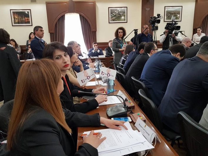 Արդեն տեղեկացրել ենք,որ Երևանի քաղաքապետարանում այսօր դարձյալ ավագանում նիստ է հրավիրվել,որի օրակարգում 10 հարց կա. 1. Երևանի ավագանու 3-րդ նստաշրջանի 2-րդ նիստի օրակարգը հաստատելու մասին: 2. Վուդրո Վիլսոնի անվամբ փողոց անվանակոչելու մասին, Վուդրո Վիլսոնի հուշարձանի տեղադրման մասին: 3. Մարտի 1-ի զոհերի հիշատակը հավերժացնող հուշարձանի տեղադրման մասին: 4. Հողի հարկի գծով արտոնություն սահմանելու մասին: 5. Երևան քաղաքի 2017 թվականի բյուջեի կատարման հաշվետվությունը հաստատելու մասին: 6. Երևանի զարգացման 2017 թվականի ծրագրի իրականացման հաշվետվության մասին: 7. Երևանի քաղաքի ավագանու 2017 թվականի դեկտեմբերի 26-ի N93-Ն որոշման մեջ փոփոխություններ կատարելու մասին: 8. Հողամասի նպատակային նշանակությունը փոխելու մասին: 9. Հողամասերի փոխանակությանը համաձայնություն տալու մասին: 10. Գույք ընդունելու մասին: Նախապես որորշվել էր ,որ նախորդ լարված նիստից հետո,լրագրողների պետք է նիստի աշխատանքներին հետևեին հատուկ հատկացված սրահից,սակայն առավոտյան տեղի ունեցած ակցիայից հետո քաղաքապետարանի աշխատակազմը զիջել,լրագրողները մուտք գործեցին նիստերի դահլիճ: Նիստին «Երկի ծիրանի» կուսակցության անդամները մասնակցում են: Նրանք առաջարկել են Վազգեն Սարգսյանի անվան փողոցն անվանակոչել Վուդրո Վիլսոնի անունով: ԵԼՔ դաշինքից Անի խաչատրյանը «Երկիր ծիրանի»-ին մեղադրեց սրբապղծության, դավաճանության, ազգային արժեքները ոտանահարելու մեջ՝ ասելով, որ միայն ապազգային քաղաքականություն վարող ուժը կարող է այդպիսի առաջարկ անել: Ավելի ուշ ԵԼՔ դաշինքը լքեց ավագանու նիստն ուաշխատանքներին հետևում է հատուկ սրահից՝ուղիղ կապի միջոցով: