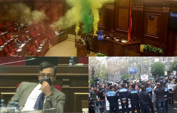 Հայկական ժամանակ օրաթերթը գրում է.Երեկ խորհրդարանում երկրորդ անգամ Քաղաքացիական պայմանագիր կուսակցության պատգամավորները ԱԺ ամբիոնից իրազեկեցին ապրիլի 13-ից Ազատության հրապարակում սպասվող շուրջօրյա հանրահավաքների մասին: Պատգամավոր Արարատ Միրզոյանը մոտեցավ ԱԺ ամբիոնին եւ հայտարարեց կայանալիք հանրահավաքի մասին, այնուհետ հանեց ֆայերը, վառեց այն եւ նշեց, որ սա «Ազատության ջահ»-ն է: Նրան միացավ նաեւ պատգամավոր Լենա Նազարյանը: ՔՊ-ի պատգամավորների այս քայլից հետո ԱԺ լիագումար նիստերի դահլիճն ամբողջությամբ ողողվեց գունավոր ծխով: ՀՀԿ-ական պատգամավորներից Էդուարդ Շարմազանովը հայտարարեց, որ շոուն չի ստացվել, իսկ ԱԺ կանոնակարգով սահմանված կարգով համապատասխան քայլեր կձեռնարկվեն: Մասնագիտությամբ մանկաբույժ, խորհրդարանի նախագահ Արա Բաբլոյանն էլ մեկ այլ մտահոգություն հայտնեց՝ հանկարծ աշխատակիցների առողջությանը վտանգ չսպառնա կամ հրդեհ չբռնկվի: «Պատկերացնում ենք, եթե այստեղ հրդեհ լինի, 700 հոգու կյանքը կվտանգվեր: Ես սա ընդունելի չեմ համարում»,- ասաց Բաբլոյանը: Մեր զրույցում Արարատ Միրզոյանը մեկ անգամ եւս նշեց, որ այդ նյութը անվտանգ, անվնաս է: Օգտագործվում է մարզադաշտերում եւ վաճառվում է ամբողջ աշխարհում: Մեր հարցին՝ ԱԺ նիստերի դահլիճում կարելի՞ է կիրառել, Միրզոյանը պատասխանեց. «Ազգային ժողովի դահլիճը բավականին ընդարձակ տարածք է եւ չի վնասի մարդկանց»: ՔՊ-ի պատգամավորների այս ակցիան խիստ ջղաձգել էր ՀՀԿ-ական պատգմավորներին: Նրանք մասնավոր զրույցներում նշում էին՝ հատկապես նյարդայնացած են այն հանգամանքից, որ նախապես տեղյակ չեն եղել, թե իրենց ինչ «անակնկալ» է սպասվում: Այնուամենայնիվ, ՀՀԿ-ականները Միրզոյանին տեսնելով ամբիոնի մոտ արդեն հասկացել են, որ Լենա Նազարյանի նախորդ ելույթի տրամաբանական շարունակությունն է լինելու: Սակայն, երեկ օրվա վերջին ՀՀԿ-ականներից մեկը կրկին մասնավոր զրույցում նշեց, որ չէին էլ կարող պատկերացնել, որ նման բան կարող է լինել: Մեր հարցին՝ արդյո՞ք ապրիլի 13-ից մինչեւ 17-ը տեղի ունենալիք քայլերից էլ ՀՀԿ-ն անակնկալի կգա, մեր զրուցակիցը նշեց, որ պատրաստված են, բայց ավելորդ զգուշությունը ոչ ոքի չի խանգարի: ՀՀԿ-ն միակ խմբակցությունը չէ, որ երեկ ՔՊ-ի երկու պատգամավորների նախաձեռնությունից անակնկալի եկավ: Բանից անտեղյակ էին նաեւ ԵԼՔ-ի Լուսավոր Հայաստանի թեւի ներկայացուցիչները: Նրանցից Գեւորգ Գորգիսյանն ավելի շատ նյարդայնացավ, քան ԱԺ փոխխոսնակը: Նա պահանջեց անգամ լրացուցիչ ընդմիջում հայտարարել, իսկ վերջում այլ ելք չունենալով թաշկինակով սկսեց պաշտպանվել ծուխը շնչելուց: Գորգիսյանն այնքան էր նյարդայնացել, որ դահլիճից դուրս գալուց խփել էր «Ազատություն» ռադիոկայանի լրագրողի բարձրախոսին, երբ թղթակիցը խնդրել էր մեկնաբանել իր դաշինքի պատգամավորների նախաձեռնությունը: Լուսավոր Հայաստանի պատգամավորները նախապես տեղյակ չեն եղել ՔՊ-ի ակցիայի մասին: Մանե Թանդիլյանը լրագրողների հետ զրույցում նշեց, որ այս քայլը գործընկերային չէ եւ պետք է իրենք անակնկալի չգային: «Իրականում այս ակցիայի մասին մենք տեղեկություն չենք ունեցել, եւ ես գտնում եմ՝ դա գործընկերային չէ՝ գալ այստեղ եւ առանց մեզ հետ քննարկելու նմանատիպ ակցիա անել: Ես, իհարկե, շատ ավելի կողջունեի, եթե այդ քայլը քննարկված լիներ: Այնուամենայնիվ, քանի որ դահլիճում հեգնական արտահայտություններ էին հնչում, ես կոչ արեցի գործընկերներին՝ չհեգնել իրավիճակը և ըմբռնումով մոտենալ»,- ասաց Թանդիլյանը: Նկատենք նաեւ, որ Մանե Թանդիլյանն ավելի վաղ ԱԺ ամբիոնից հայտարարել էր, որ պետք չէ ՔՊ-ի այս գործողությանը հեգնանքով արձագանքել: «Սա դրդված քայլ էր առ այն, որպեսզի կարողանանք հասկանալ Հայաստանում տիրող
