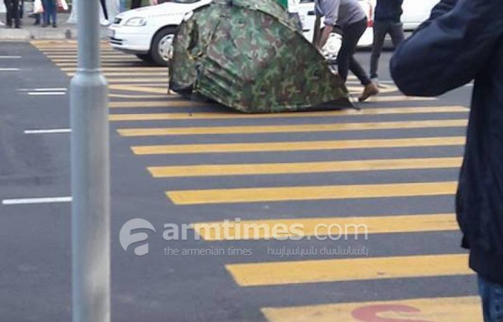 #Մերժիր Սերժին եւ #ԻմՔայլը նախաձեռնության անդամները Ֆրանսիայի հրապարակում՝ Բաղրամյան պողոտայի սկզբնամասում վրան էին տեղադրել:Երեւանի փոխոստիկանապետ Վալերի Օսիպյանի կարգադրությամբ՝ մի քանի ցուցարարի մտցրել են ոստիկանական մեքենա, սակայն փոխոստիկանապետի հավաստմամբ՝ նրանց բերման չեն ենթարկել;