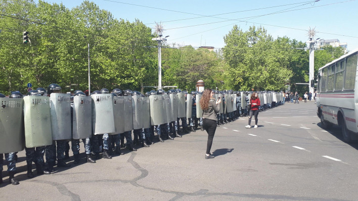 Ցուցարարները, Ազգային ժողովի պատգամավոր Նիկոլ Փաշինյանի գլխավորությամբ, շաժվում են Ֆրանսիայի հրապարակ: Մաշտոցի պողոտայի այդ հատվածում վահաններով ոստիկանները պատ են կազմել: