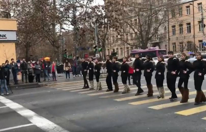 Պարի խումբը զուռնա-դհոլով փակել է Թումանյան փողոցը՝ Թումանյան-Մաշտոցի պողոտա խաչմերուկի հատվածում: Համացանցում տեսանյութ է հայտնվել: