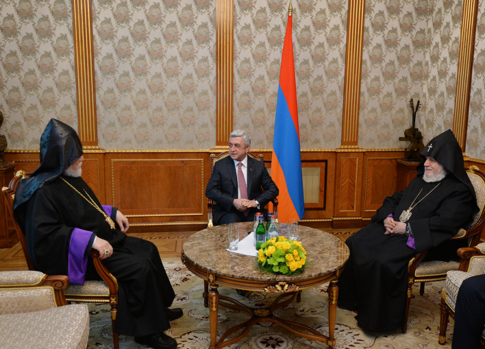 Վարչապետ Սերժ Սարգսյանն այսօր հյուրընկալել է Ն.Ս.Օ.Տ.Տ. Գարեգին Բ Ծայրագույն Պատրիարք և Ամենայն Հայոց Կաթողիկոսին և Ն.Ս.Օ.Տ.Տ. Արամ Ա Մեծի Տանն Կիլիկիո Կաթողիկոսին: Վարչապետի պաշտոնը ստանձնելուց հետո Սերժ Սարգսյանի հետ առաջին հանդիպմանը Վեհափառ Հայրապետը և Մեծի Տանն Կիլիկիո Կաթողիկոսը նախ իրենց շնորհավորանքներն են փոխանցել վարչապետին՝ մաղթելով նրան ուժ, կարողություն, համբերություն, տոկունություն: Զրուցակիցները հանդիպման ժամանակ անդրադարձել են նաև այս օրերին հանրապետությունում բողոքի արտահայտման զանգվածային միջոցառումներին՝ տեղի ունեցող հավաքներին, երթերին և իրենց մտահոգությունները հայտնել ստեղծված իրավիճակի կապակցությամբ: Բնական համարելով, որ ցանկացած երկրի ներսում կարող են լինել դժգոհություններ, պահանջներ, մտահոգություններ, կաթողիկոսները կարևորել են բողոքի արտահայտումը բացառապես քաղաքակիրթ եղանակով՝ հարգելով պետության սահմանադրական կարգն ու օրենքները: Ամենայն Հայոց Կաթողիկոսը և Մեծի Տանն Կիլիկիո Կաթողիկոսը միաժամանակ իրենց գոհունակությունն ու գնահատանքն են հայտնել, որ տեղի ունեցող գործընթացում ուժի կիրառումը, բախումները, ընդհարումները տեղ չունեն: «Աղոթում ենք, որպեսզի աստիճանաբար այս իրավիճակը հանդարտվի, խաղաղվի, և մարդիկ լծվեն մեր հայրենաշինության, մեր երկրի անվտանգության նվիրական գործին: Մենք, այո՛, ունենք դժվարություններ մեր կյանքում, բայց նաև բազում մարտահրավերներ և այդ մարտահրավերների առջև կարող ենք կանգնել ու դիմակայել դրանք միայն ազգային համախմբվածությամբ և միասնականությամբ: Առջևում նաև ապրիլի 24-ն է՝ Մեծ եղեռնի հիշատակի օրը: Եվ այդ օրվա խորհուրդը պիտի որ յուրաքանչյուր հայորդու գիտակցության, ընկալումների մեջ լինի և առաջնորդի՝ շիտակ ապրելու և շիտակ մեր ընթացքը առաջնորդելու, որպեսզի մենք զերծ պահենք մեր երկիրը ողբերգություններից, կորուստներից: Մենք ունենք Արցախ, մենք ունենք մեր հայրենիքի սահմանների վրա ծառայող երիտասարդ հայորդիներ, որոնց անվտանգությունը, գիտենք, պարո՛ն վարչապետ, Ձեր մշտական մտահոգությունն է: Մենք հաղորդ ենք եղել Ձեր մտածումներին այս առումով: Թող Աստված պահի, պահպանի մեր ժողովրդին սիրո, խաղաղության մեջ: Այս է մեր մաղթանքը, այս է մեր աղոթքը»,-ասել է Ամենայն Հայոց Կաթողիկոսը: Մեծի Տանն Կիլիկիո Կաթողիկոս Արամ Ա-ն, նշելով, որ միանգամայն կիսում է Գարեգին Վեհափառի մտահոգությունները, ընդգծել է, որ այս օրերին երկրում երիտասարդների, պատանիների ներգրավմամբ տեղի ունեցող իրադարձությունների ժամանակ գրգռիչ արտահայտություններով լարվածության, անորոշության մթնոլորտի ստեղծումը վնասում է թե՛ մեր ժողովրդին, թե՛ մեր երկրի ընկալմանն արտաքին աշխարհում: «Վերջիվերջո, այս ցույցերի հետևանքները կամ դրանց ընթացքում հասցված վնասների հաղթահարումը ամիսներ են տևելու: Այսինքն՝ երկիրը կարող է վնասվել: Մենք պետք է ցուցարարներին ասենք՝ սա մեր բոլորիս հայրենիքն է, բոլորս այս հայրենիքի զավակներն ենք, մի ընտանիք ենք: Դժվարություններ, հարցեր կլինեն, սակայն պետք է նստել, փոխադարձ հասկացողությամբ հարցերը քննել սեղանի շուրջ, ոչ թե փողոցում: Հարցերը քննելու միասնական այդ ճիգով դրանց լուծման ճամփաներ պետք է որոնել միասնաբար: Սա է, որ պետք է լինի: Այս մթնոլորտում նման ձևով շարունակելը վնաս է՝ վնաս է հայրենիքին, վնաս է մեր ժողովրդին: Հետևաբար, ես ուրախ եմ, որ նաև Դուք, պարո՛ն վարչապետ, այդ կոչը արել եք, որ ուժերը կողք կողքի գան և սեղանի շուրջ նստեն ու խոսեն: Նախագահի և Ձեր գլխավորությամբ այդ խոսակցությունը պետք է լինի, որովհետև այս կացության շարունակումը մեծապես կվնասի մեր հայրենիքին, մեր ժողովրդին, Արցախին մանավանդ: Ժամանակն է,