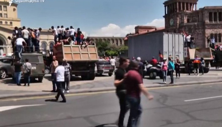 Բազմաթիվ քաղաքացիներ հրապարակ են գալիս նաև բեռնատարներով, պտույտ կատարում կենտրոնում՝ ՀՀ եռագույնը ծածանելով: Նրանք սպասում են Նիկոլ Փաշինյանին: