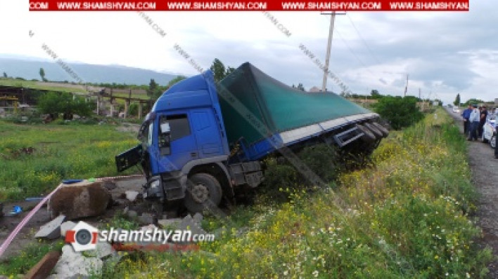 Խոշոր ավտովթար Արագածոտնի մարզում. բուլղարացի վարորդը Iveco բեռնատարով մասամբ կողաշրջվել ու բախվել է էլեկտրասյանը