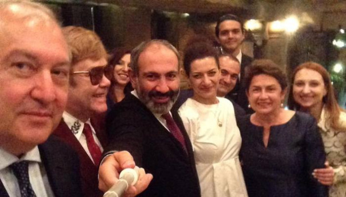 Նիկոլ Փաշինյանը լուսանկար է հրապարակել Էլթոն Ջոնի, իր կնոջ՝ Աննա Հակոբյանի, նախագահ Արմեն Սարգսյանի, նրա կնոջ՝ Նունե Սարգսյանի, մշակույթի նախարար Լիլիթ Մակունցի և այլոց հետ, որը վերնագրել է. «Սելֆի ճաշից հետո»: