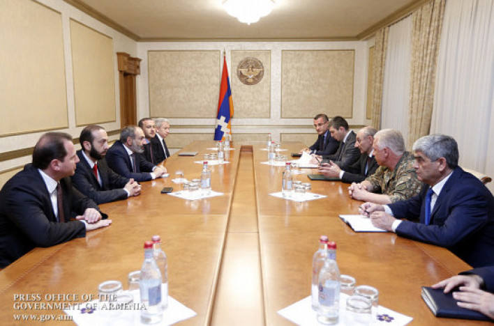 Արցախի նախագահի նստավայրում տեղի է ունեցել վարչապետ Նիկոլ Փաշինյանի և Արցախի Հանրապետության նախագահ Բակո Սահակյանի հանդիպումը, որին ներկա են եղել նաև երկու հայկական պետությունների տարբեր գերատեսչությունների ղեկավարներ, հայտնում են կառավարության լրատվական ծառայությունից: Վարչապետ Փաշինյանը նախ շնորհավորել է Արցախի կառավարության նորանշանակ անդամներին նոր պաշտոններում նշանակվելու կապակցությամբ և ընդգծել, որ ողջունում ու կարևորում է իրական և բովանդակային փոփոխություններ իրականացնելու Բակո Սահակյանի պատրաստակամությունը: «Ցանկանում եմ այդ հարցում հայտնել մեր անվերապահ աջակցությունն Արցախի գործընկերներին ու անձամբ նախագահ Բակո Սահակյանին: Հայաստանի կառավարությունն անվերապահորեն աջակցում է Ձեր բռնած քաղաքական կուրսին», - ասել է Նիկոլ Փաշինյանը: Հանդիպման ընթացքում զրուցակիցներն անդրադարձել են հայկական երկու պետությունների փոխգործակցությանը և դրա ընդլայնմանը վերաբերող մի շարք հարցերի: ՀՀ վարչապետը և Արցախի նախագահը քննարկել են բանակաշինության, տնտեսության և մի շարք այլ ոլորտներին վերաբերող հարցերի լայն շրջանակ՝ կարևորելով փորձի փոխանակումը և ավելի սերտ փոխգործակցությունը համապատասխան գերատեսչությունների միջև: