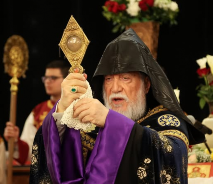 * Վեհափառ Հայրապետը կ՚օրհնէ հաւատացեալ ժողովուրդը Քրիստոսի խաչափայտի սուրբ մասունքով, որ ի պահ դրուած է Կաթողիկոսարանի «Կիլիկիա» թանգարանին մէջ։