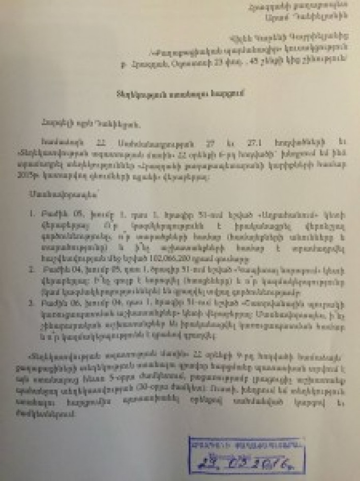 Հրազդանի քաղաքապետի թեկնածու Սասուն Միքայելյանի նախընտրական շտաբի անդամ Վիլեն Գաբրիելյանն այսօր գրություն է հանձնել Հրազդանի քաղաքապետարանում: Հրազդանի գործող ՀՀԿ-ական քաղաքապետ Արամ Դանիելյանին ուղղված գրության մեջ մասնավորապես նշված է. «Հարգելի պարոն Դանիելյան, համաձայն ՀՀ Սահմանադրության 27 եւ 27.1 հոդվածների եւ «Տեղեկատվության ազատության մասին» ՀՀ օրենքի 6-րդ հոդվածի, խնդրում եմ ինձ տրամադրել տեղեկություններ «Հրազդանի քաղաքապետարանի կարիքների համար 2018 թվականին կատարվող գնումների պլանի» վերաբերյալ: Մասնավորապես 1. Բաժին 05, խումբ 1, դաս 1 ծրագրի 51-ում նշված աղբահանում կետի վերաբերյալ: Ո՞ր կազմակերպությունն է իրականացրել վերոնշյալ գործունեությունը, ո՞ր տարածքների համար (համայնքների անունները եւ տարածությունը) եւ ինչ աշխատանքների համար է տրամադրվել հաշվետվության մեջ նշված 102.066.200 դրամ գումարը: 2. Բաժին 04, խումբ 05, դաս 1 ծրագրի 51-ում նշված «Կապիտալ նորոգում» կետի վերաբերյալ: Ի՞նչ գույք է նորոգվել (հասցեները) եւ որ կազմակերպությունը (կամ կազմակերպություններն) են զբաղվել տվյալ գործունեությամբ: 3. Բաժին 06, խումբ 04, դաս 1, ծրագիր 51-ում նշված «Շատրվանային պուրակի կառուցապատման աշխատանքներ» կետի վերաբերյալ, մասնավորապես, ինչ շինարարական աշխատանքներ են իրականացվել կառուցապատման համար եւ որ կազմակերպությունն է դրանով զբաղվել: «Տեղեկատվության ազատության մասին» ՀՀ օրենքի 9-րդ հոդվածի համաձայն, քաղաքացիների տեղեկություն ստանալու գրավոր հարցմանը պատասխան տրվում է այն ստանալուց հետո 5-օրյա ժամկետում, բացառությամբ լրացուցիչ աշխատանք պահանջող տեղեկատվության (30-օրյա ժամկետ) ուստի, խնդրում եմ տեղեկություն ստանալու հարցումիս պատասխանել օրենքով սահմանված կարգով եւ ժամկետներում: Տեղեկատվության տրամադրումը մերժելու դեպքում խնդրում եմ, գրավոր տեղյակ պահել մերժման հիմքի մասին (հոդված 11) պատրաստ եմ վճարել տեղեկատվության պատճենահանման ծախսերը: Կանխավ շնորհակալ եմ Վիլեն Կարենի Գաբրիելյան»: