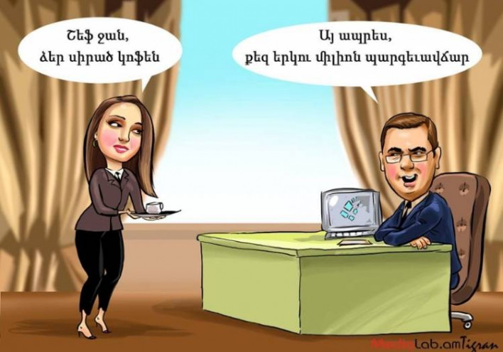 «Մեդիալաբը» նոր ծաղրանկարներ է հրապարկել։ Ինչպես հայտնի է ՊԵԿ նախագահ Դավիթ Անանյանը շուրջ 2 մլն դրամ պարգևավճար էր գրել գործավարուհու համար։ Ըստ «Մեդիալաբի»՝ Անանյանը այդ որոշումը կայացրել է հետևյալ կերպ․ «Շեֆ ջան, Ձեր սիրած կոֆեն», «Այ ապրես, քեզ 2 մլն պարգևավճար»։