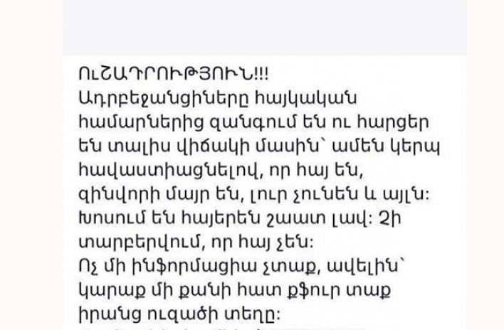 «Ֆեյսբուք» սոցիալական ցանցում մի շարք օգտատերեր զգուշացնող գրառումներ են տարածում՝ հորդորելով քաղաքացիներին հեռախոսազրույցներում զգույշ լինել։«Ժողովուրդ, հնարավոր է ձեր բջջայինի վրա հայկական կոդով անծանոթ համարներից զանգեր կամ հաղորդագրություններ գան, չպատասխանեք, ամենայն հավանականությամբ դա թշնամու կողմից ձեռնարկված գաղտնալսման փորձ է կատարվում: Եվ ընդհանրապես՝ ձեր բոլոր հեռախոսազրույցների մեջ շատ զգույշ և զուսպ եղեք»,- ասվում է զգուշացումներից մեկում:Տարածված մեկ այլ հայտարարության մեջ խոսվում է այն մասին, որ ադրեջանցիները զանգում են հայկական համարներից ու սկսում հարցեր տալ։ Ընդ որում՝ շատ մաքուր հայերենով: Այս գրառման մեջ նշված էր նաև այն հեռախոսահամարը, որով քաղաքացին զանգ էր ստացել ադրբեջանցիներից: Սակայն հասկանալի պատճառներով հեռախոսահամարը չենք հրապարակում:
