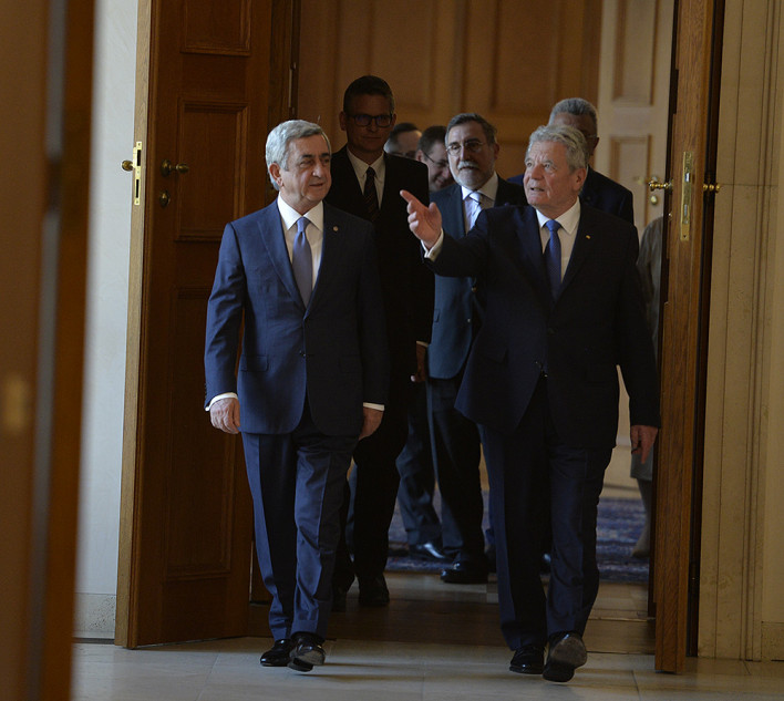 Սերժ Սարգսյանը հանդիպման սկզբում նախ շնորհակալություն է հայտնել Նախագահ Գաուկին` նրա մարդասիրական գործունեության համար, նշելով, որ դրա շնորհիվ ԳԴՀ Նախագահի անունն ու գործունեությունը քաջ հայտնի են նաև Հայաստանում։ ՀՀ Նախագահը պատահական չի համարել, որ համայն հայությունը երախտիքով ընդունեց անցյալ տարվա ապրիլին Բեռլինի Մայր տաճարում Հայոց ցեղասպանության զոհերի հիշատակին նվիրված էկումենիկ պատարագի ժամանակ Նախագահ Գաուկի ելույթը, որը հայ ժողովրդի համար մեծ կարևորություն ունի։ Նախագահ Սարգսյանը նշել է, թե ուրախ է հանդիպել մի մարդու, ով գտավ ամենաճիշտ բառը` բնութագրելու Հայոց ցեղասպանությունը: Նա չափազանց կարևոր է համարել Բունդեսթագի կողմից Հայոց ցեղասպանության ճանաչումը, որով, ըստ Նախագահի, կամբողջանա Գերմանիայի կողմից Ցեղասպանության ճանաչման գործընթացը: