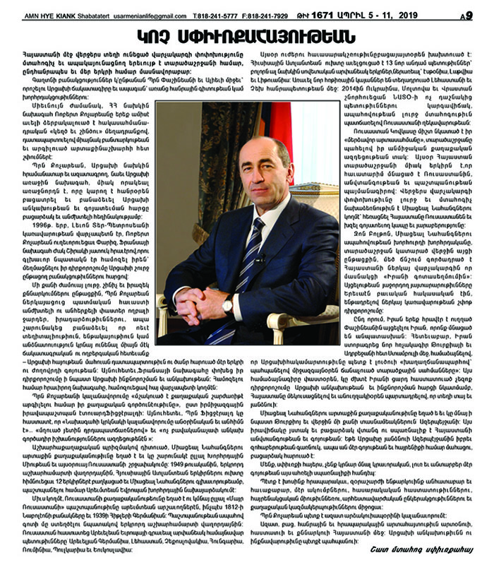 ԱՄՆ «HYE KIANK» շաբաթաթերթն անդրադարձել է Հայաստանի Հանրապետությունում եւ տարածաշրջանում տեղի ունեցող իրադարձություններին, մասնավորապես՝ ՀՀ երկրորդ նախագահ Ռոբերտ Քոչարյանի ձերբակալմանը: