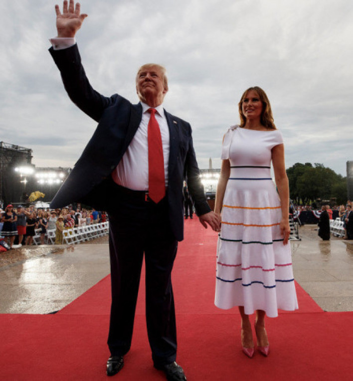 Մելանյա Թրամփը Վաշինգտոնում` Լինկոլնի հուշարձանի մոտ, ներկայացել է Անկախության տոնին նվիրված շքերթին: ԱՄՆ առաջին տիկինը կրել է տարբեր գույների գծեր ունեցող սպիտակ զգեստ և վարդագույն բարձրակրունկներ, գրում է Yahoo-ն: