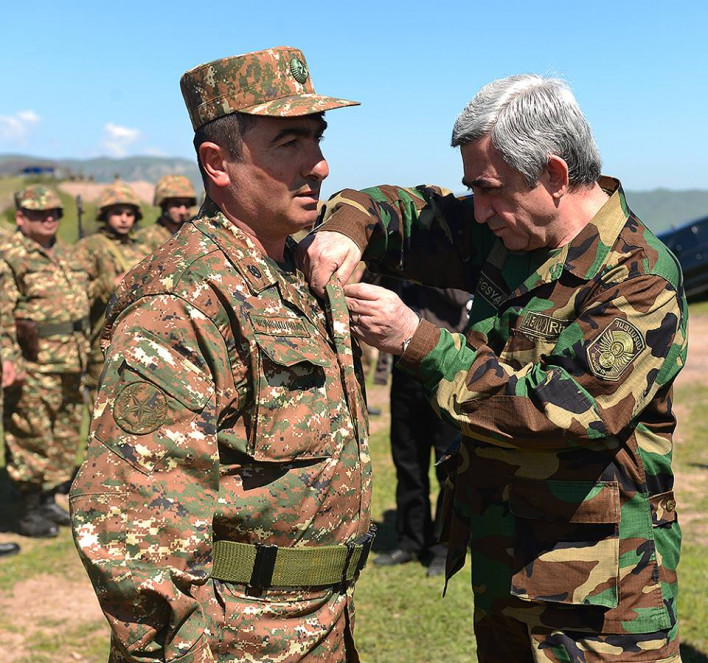 ՀՀ Նախագահ Սերժ Սարգսյանը և ԼՂՀ Նախագահ Բակո Սահակյանը Լեռնային Ղարաբաղի Հանրապետությունում այսօր այցելել են Պաշտպանության բանակի զորամասերից մեկը և ապրիլի 2-5-ը ընկած ժամանակահատվածում հակառակորդի սանձազերծած ռազմական գործողությունների ընթացքում ԼՂՀ պետական սահմանը պաշտպանելիս ցուցաբերած արիության ու խիզախության համար պետական պարգևներ հանձնել մի խումբ զինծառայողների:
