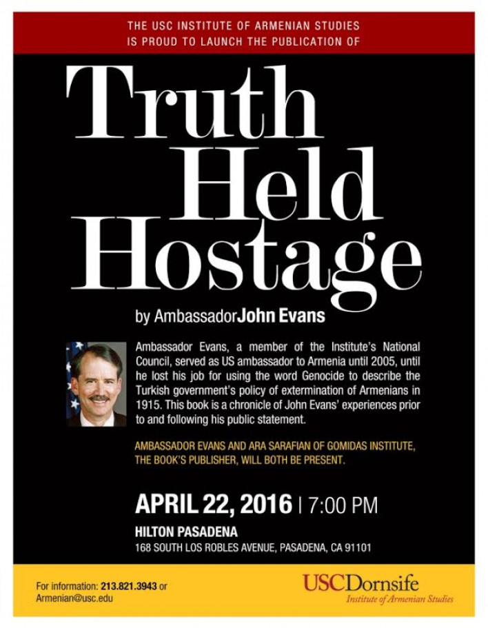 Հարավային Կալիֆոռնիայի համալսարանի Հայկական ուսումնասիրությունների ինստիտուտում ապրիլի 22-ին կկայանա Հայաստանում ԱՄՆ նախկին դեսպան Ջոն Էվանսի «Պատանդված ճշմարտություն. Ամերիկան և Հայոց ցեղասպանությունը» (Truth Held Hostage, America and the Armenian Genocide – What then? What now?) գրքի շնորհանդեսը: Այս մասին հայտնում է Asbarez-ը։