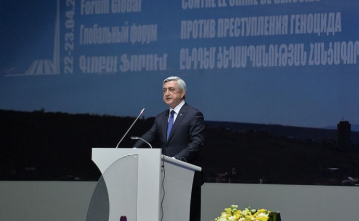 «Ընդդեմ ցեղասպանության հանցագործության» երկրորդ գլոբալ ֆորումի մեկնարկին բացման խոսքում այս մասին ասաց ՀՀ Նախագահ Սերժ Սարգսյանը: «2015թ. մի հանգրվան էր, երբ մենք վերաիմաստավորել ենք մեր ժողովրդի գոյության իրավունքի և պատմական արդարությանն ուղղված 100-ամյա պայքարը: Մենք աշխարհին ուղղված երախտագիտության և վերածննդի ուղերձներ ենք ուղարկել, ասել ենք, որ Հայաստանը լինելու է այդ հանցագործության դեմ պայքարի առաջամարտիկներից մեկը: Ցեղասպանության անթույլատրելիության մասին պետք է գիտակցում ապահովել՝ նման հանցագործությունից խուսափելու համար»,- ասաց ՀՀ Նախագահը: