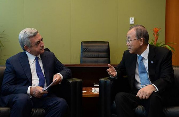 ՀՀ Նախագահ Սերժ Սարգսյանը և ՄԱԿ-ի գլխավոր քարտուղար Բան Կի Մունն ապրիլի 23-ին հեռախոսազրույց են ունեցել: Հեռախոսազրույցը տեղի է ունեցել ՄԱԿ գլխավոր քարտուղարի նախաձեռնությամբ: Այս մասին տեղեկացնում են ՀՀ Նախագահի աշխատակազմի հասարակայնության և տեղեկատվության միջոցների հետ կապերի վարչությունից: Զրույցի ընթացքում Գլխավոր քարտուղար Բան Կի Մունը ափսոսանք է հայտնել, որ չնախատեսված հանգամանքների բերումով հետաձգվել է իր այցը Հայաստան: Գլխավոր քարտուղարը, կարևորելով ԼՂ հիմնահարցի խաղաղ կարգավորման գործընթացը` իր լիակատար աջակցությունն է հայտնել ԵԱՀԿ Մինսկի խմբի համանախագահողների գործունեությանը: Նախագահ Սարգսյանը, նշելով, որ Հայաստանի հասարակությունը վաղուց ի վեր սպասում է Գլխավոր քարտուղարի այցին, հույս է հայտնել, որ կհաջողվի նրա այցը իրականացնել փոխադարձաբար համաձայնեցված նոր ժամկետներում: