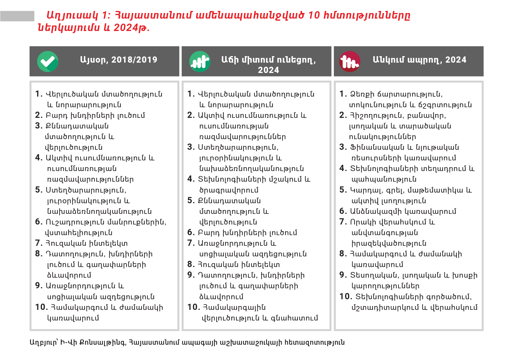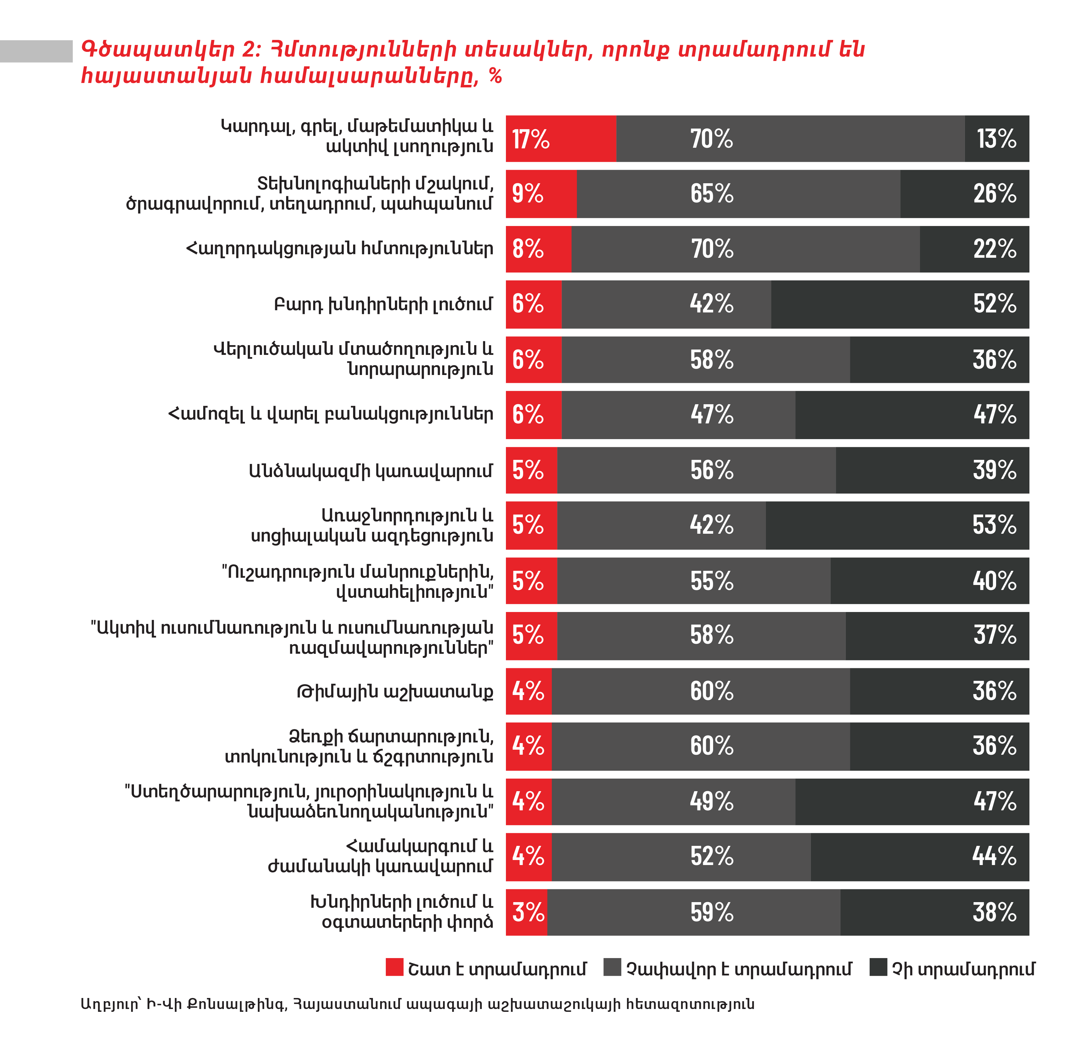 Գործարարները դժգոհ են շրջանավարտների գիտելիքի և հմտությունների որակից: Աշխատանքի վերափոխումները հասցեագրելու համար Հայաստանին անհրաժեշտ է մարդկային կապիտալի զարգացման համապարփակ ռազմավարություն: Երկրի կրթության որակը բարելավման կարիք ունի, որպեսզի կարողանա հարմարվել աշխատանքի շարունակ փոփոխվող հմտությունների պահանջարկին և բավարարել աշխատաշուկայի պահանջները: