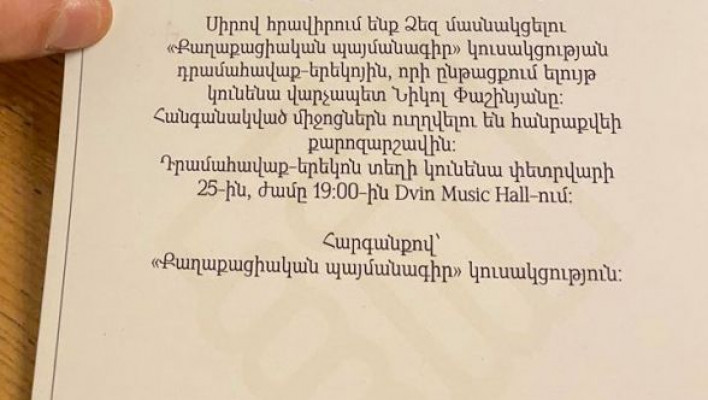Այսօր երեկոյան բավականին հետաքրքիր իրողություն է արձանագրվելու երևանյան խոշոր հյուրանոցներից մեկի ընդարձակ սրահում: Գործող իշխանության նախաձեռնած խնդրահարույց հանրաքվեին ընդառաջ՝ վարչապետի «Քաղպայմանագիր» կուսակցությունը «այո»-ի քարոզարշավ իրականացնելու համար ֆինանսական միջոցներ ներգրավելու նպատակով դրամահավաք-երեկո է կազմակերպել: