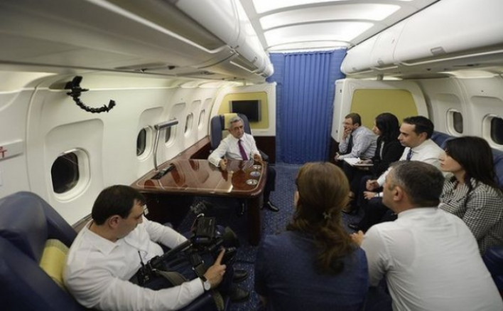 ՀՀ Նախագահ Սերժ Սարգսյանը Վիեննայից Երևան վերադառնալու ճանապարհին օդանավում այցը լուսաբանող լրագրողներին հարցազրույց է տվել` ներկայացնելով ԵԱՀԿ Մինսկի խմբի համանախագահող երկրների նախաձեռնությամբ կայացած հանդիպումների արդյունքները: