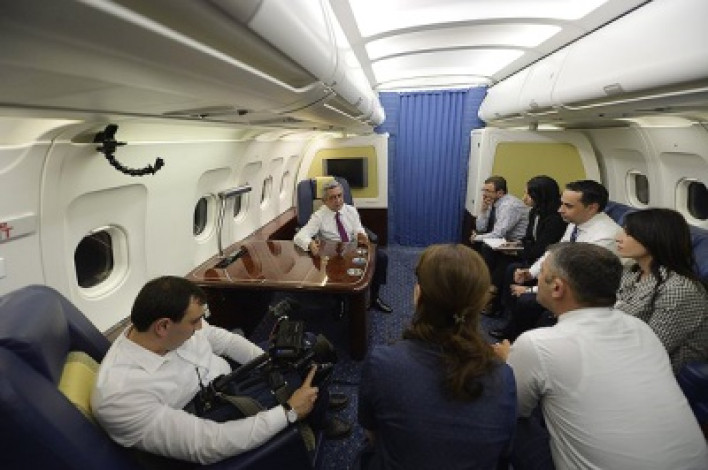 ՀՀ Նախագահ Սերժ Սարգսյանը Վիեննայից Երևան վերադառնալու ճանապարհին օդանավում հայաստանցի լրագրողներին ներկայացրել է ԵԱՀԿ Մինսկի խմբի համանախագահող երկրների նախաձեռնությամբ կայացած հանդիպումների արդյունքները: Այդ մասին Twitter-ի իր միկրոբլոգում հայտնել է ՀՀ նախագահի մամուլի խոսնակ Վլադիմիր Հակոբյանը և տեղադրել լուսանկարներ: