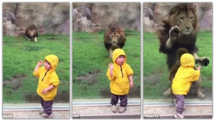 Երկու տարեկան երեխան կենդանաբանաիկան այգում ապակե վանդակից նայում է առյուծին, սակայն, երբ երեխան պտտվում է տեսախցիկին նայելու համար, առյուծը վեր է կենում ու վազում դեպի նա: