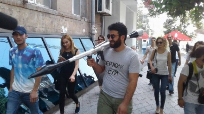 Այս պահին ակտիվիստ Միքայել Նազարյանը, իր պատրաստած ռուսական РГД-5 ստվարաթղթե զենքը ձեռքին, պտտվում է Երևանի կենտրոնի փողոցներով։ Նա այս կերպ աջակցություն է հայտնում թղթե հրասայլի համար ամբաստանյալի աթոռին հայտնված Արտակ Գևորգյանին: