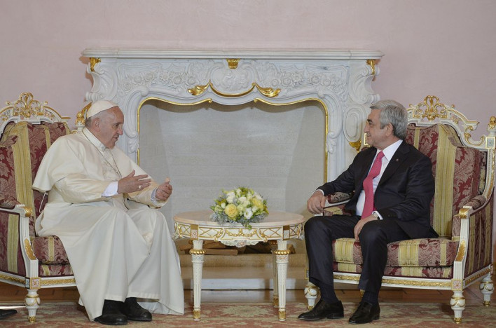 Նախագահի նստավայրում սկսվել է Հռոմի Սրբազան Քահանայապետ Ֆրանցիսկոս Պապի ընդունելությունը, որտեղ նախատեսված է հանդիպում ՀՀ իշխանությունների, հասարակայնության և Երևանում հավատարմագրված դիվանագիտական կորպուսի ներկայացուցիչների հետ: Մինչ այդ, Նախագահ Սերժ Սարգսյանը և Սրբազան Քահանայապետը ՀՀ Նախագահի նստավայրի «Ոսկեզօծ» դահլիճում առանձնազրույց են ունեցել: