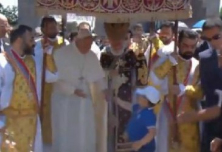 Մայր Աթոռ Սուրբ Էջմիածնում՝ Սուրբ Տրդատի բաց խորանի առջև առաջնորդական Սուրբ պատարագի ավարտից հետո Հռոմի պապին բազմության միջից մոտեցավ մի երեխա և նրանց փոխանցեց Հայաստանի դրոշը: