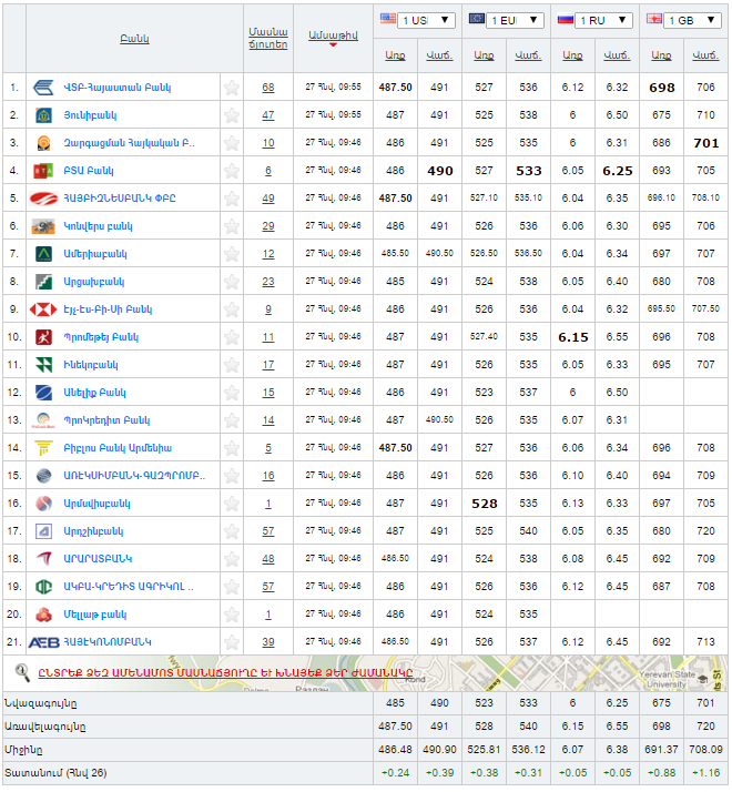 Հայաստանյան բանկերի կողմից այսօր` հունվարի 27-ի համար սահմանված են արտարժույթների փոխարժեքները. 1 դոլարը գնվում է 486.57 ՀՀ դրամ միջին փոխարժեքով, վաճառվում` 490,86 դրամով: Դոլարի վաճառքի առավելագույն փոխարժեքը 491 դրամ է:
