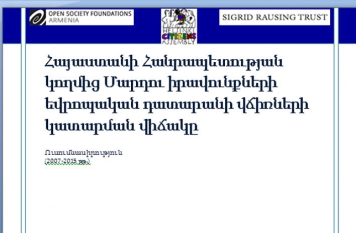 Ներկայացվող զեկույցի ուսումնասիրության նպատակն է եղել ամփոփ տեղեկատվություն տրամադրել Հայաստանում ՄԻԵԴ վճիռների կատարման մեխանիզմների, 2007 թ. մինչև 2015 թ. դեկտեմբերի 31-ը ՀՀ վերաբերյալ Մարդու իրավունքների եվրոպական դատարանի վճիռների կատարման վիճակի վերաբերյալ՝ բացահայտելով և վճիռների կատարման մեխանիզմների, և առանձին վճիռների կատարման նպատակով համակարգային լուծում և ընդհանուր բնույթի միջոցառումներ պահանջող խնդիրը և ներկայացնել դրանց լուծման ուղղությամբ առաջարկություններ: Ուսումնասիրության առարկա են հանդիսացել ՀՀ վերաբերյալ Եվրոպական դատարանի թվով 55 վճիռ, որոնցից մեկը ուսումնասիրության ժամանակահատվածում դեռևս ուժի մեջ չէր մտել: Նշված վճիռներով արձանագրված խախտումները և վճիռների կատարման ընթացքը ամփոփված է «Ամփոփ տեղեկատվություն Հայաստանի Հանրապետության դեմ կայացված Մարդու իրավունքների եվրոպական դատարանի վճիռների և դրանց կատարման վերաբերյալ» տեղեկանքում: Զեկույցում մանրամասն անդրադարձ չի կատարվել առանձին գործերով անհատական բնույթի միջոցառումների և արդարացի փոխհատուցման վճարման վիճակին, այլ ուսումնասիրվել է դրանց համակարգային պատկերը: Զեկույցի պատրաստման ընթացքում օգտագործվել են պաշտոնական աղբյուրներում տեղադրված տեղեկատվությունը, քաղաքացիական հասարակության կողմից կատարված և այլ ուսումնասիրություններ: Զեկույցն ամբողջությամբ՝ այստեղ. Հելսինկյան Քաղաքացիական Ասամբլեայի Վանաձորի գրասենյակ