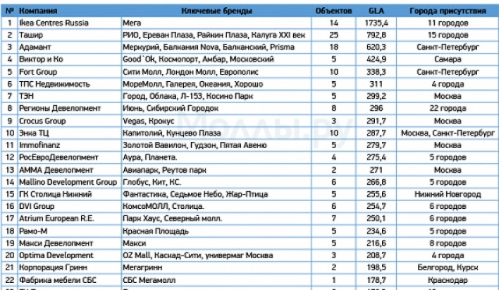 Ուսումնասիրությունների տվյալներով՝ հիմնական բրենդները, որոնք պատկանում են «Տաշիր»-ին, «ՌԻՕ»-ն, «Երևան Պլազա»-ն, «Ռայկին Պլազա»-ն և «Կալուգա XXI դարն» են: Ընդհանուր առմամբ, ընկերությունը ներառում է 25 օբյեկտներ և առկա է 15 քաղաքներում: Ցուցանիշների համաձայն՝ «Տաշիր» ընկերությունների խումբը զբաղեցնում է 793 հազար քառ. մ տարածք: Ցուցակը գլխավորել է «Ikea Centres Russia»-ն, որի ենթակայության տակ են գտնվում «Մեգա» բոլոր առևտրի կենտրոնները: