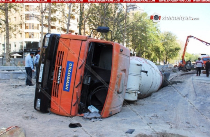 Երևանի Արամի փողոցում ցեխով բեռնված «ԿամԱԶ» է կողաշրջվել. լուսանկարներ