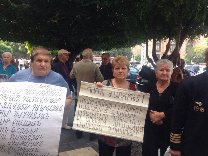Կառավարության շենքի դիմաց այս հինգշաբթի սովորականից մարդաշատ էր: Վարչապետի հետ հանդիպում էին պահանջում բազմաթիվ քաղաքացիներ, որոնց թվում էին նաև 2001թ. Իրանում վթարված ինքնաթիռի անձնակազմի 5 անդամների ընտանիքները, ովքեր պահանջում էի օրենքով սահմանված ամսական գումարները: Hayeli.am-ի հետ զրույցում զոհված օդաչու Սամվել Գրիգորյանի մայրը՝ Ջեմա Հովհաննիսյանը, պատմեց, որ մոտ ութ տարի է՝ իրենք օրենքով նախատեսված գումարը չեն կարողանում ստանալ: «Միակ տղաս զոհվեց: Նշանակեցին կերակրողին կորցնելու նպաստ, մինչև 2008թ. բողքներով մի կերպ ստացել ենք գումարը, դրանից հետո ոչ մի բան չենք տացել: 2014թ. նախկին վարչապետ Հովիկ Աբրահամյանն ընդունեց, խոստացավ, որ մինչև 2015թ. մարտ ամիսը մեր հարցերը կլուծեն: Վեր կացավ, ձեռք մեկնեց և դրանից հետո չընդունեց, պատասխան չտվեց: Ընդունել է Արփինե Հովհաննիսյանը, որ պիտի բյուեջի մեջ մցնեն հարցը, գոնե ամսական աշխատավարձ ստանանք:Ասեցինք թող սառեցնեն, տարեկան մի անգամ մենակ ստանանք»,-պատմեց Ջեմա Հովհաննիսյանը՝ հավելելով, որ զոհվածների հինգ ընտանիքները 8 տարի իրենք ոչ մի լումա չեն ստացել, ուզում են հանդիպել նոր վարչապետի հետ: Կնոջ խոսքով, հիմա ընտանիքն ապրում է միայն իր թոշակով, ամուսինը ևս մահացել է: Ավելի մանրամասն՝ տեսանյութում Կարինա Սահակյան