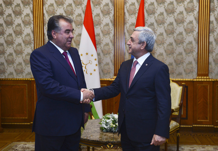 ՀՀ Նախագահը ողջունել է գործընկերոջը մեր երկրում և ընդգծել, որ Հայաստանը հետաքրքրված է զարգացնել բարեկամական, եղբայրական հարաբերությունները Տաջիկստանի հետ: Նշելով, որ հայ-տաջիկական հարաբերությունների ներկայիս մակարդակը չի համապատասխանում ոչ երկու երկրների քաղաքական հարաբերությունների բարձր մակարդակին և ոչ էլ հայ և տաջիկ ժողովուրդների բարեկամությանը, Սերժ Սարգսյանը նկատել է, որ այդուհանդերձ, միջպետական հարաբերությունները զարգացնելու դինամիկա կա, որն անհրաժեշտ է երկուստեք հետևողականորեն խորացնել ու ամրապնդել: ՀՀ Նախագահն ընդգծել է, որ Հայաստանում սիրով սպասում են Էմոմալի Ռահմոնի պաշտոնական այցին, որը համագործակցության նոր և բազմաթիվ պայմանավորվածությունների սկիզբ կհանդիսանա: