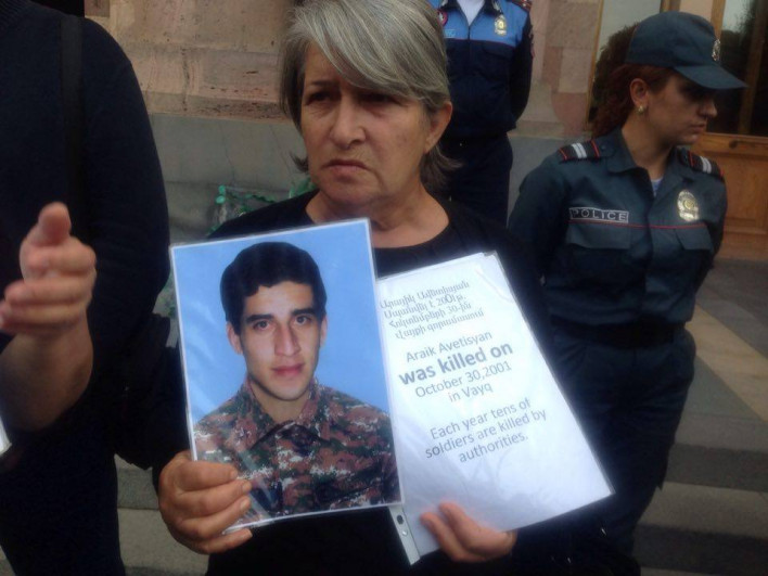 Այսօր՝ հոկտեմբերի 13-ին, զոհված զինվորների մայրերը հերթական անգամ հավաքվել էին ՀՀ կառավարության շենքի առաջ: Նրանց պահանջն անփոփոխ էր` բացահայտել իրենց որդիների սպանության գործերը: Զոհված Արայիկ Ավետիսյանի մայրը՝ Անահիտ Մկրտչյանը Hayeli.am-ի հետ զրույցում հայնտեց, որ այս տարվա հոկտեմբերի 30-ին կլրանա որդու մահվան 15 տարին: «2001 հոտեմբերի 30-ին արձակուրդից վերադարձի երկրորդ օրը երրորդ գումարտակի շտաբի պետի սենյակում ատրճանակի կրակոցով սպանել են որդուս: Ես քրեական գործով բոլոր ատյանները անցել եմ և վստահ եմ, քրեական գործով ապացույցներ էլ ունեմ, որ տղայիս սպանել է գումարտակի հրամանատարը արձակուրդից վերադարձին պահանջված 100 դոլարը չտանելու համար: Դատարանով չի պարզվել սպանություն կատարող անձը ով է, գործը հետ քննության է եկել, դրանից հետո՝ 2009թ. գործը կասեցրել են: Սկզբից ինձ ասում էին՝ ժամկետային զինծառայող Կարեն Սարգսյանն է սպանել զենքի հետ անզգույշ վարվելով, բայց դատավարության ժամանակ այդ տղային էլ արդարացրեցին, որովհետև ապացույցները չէր գնում նրա վրա: Բոլոր ապացույցները տանում էին, որ սպանութունը դիտավորություն է: Վերջում գործը կասեցրեցին, այդ տղան արդարացվեց, իսկ սպանություն կատարողը անձը անհայտ է»,-պատմեց Անահիտ Մկրտչյանը: Հարցին, թե որտեղից իրեն նման վստահություն, կինը պատասխանեց. «Իրենց սարքած քրեական գորխով 16 հատոր գլխին տիրապետում եմ, դրանից հետո 3 հատորին այդպես էլ չկարողացա տիրապետել, բայց, ըստ էության, ոիչնչ էլ չէին արել: Դատավարութան, դատաքննության ընթացքում այդ համոզմանը եկանք և ապացւոյցներ մենք ներկայացրել ենք: Այն ժամանակ գլխավոր դատախազը Աղվան Հովսեփյանն էր, 20 էջի վրա ապացույցներ փաստաբանի հետ ներկայացրեցինք, ոչ մի իրավական գնահատական չստացավ: Իմ քրեական գործը չորս դատախախազություններով պտտվել է, ցուցմունք ունեմ քրեական գործում, որ սպանությունը կատարել է գումարտակի հրամատար Մհեր Ստեփանյանը,բայց այդպես էլ նրան ձեռք չտվեցին: Պատճառաբանությունն այն է, որ սպանություն կատարող անձը անհայտ է, երբ սպանությունը կատարվել է է 9 քմ սենյակում՝ չորս հոգու ներկայությամբ»: Անահիտ Մկրտչյանը հայտնեց, որ որդին ծառայել է Վայքի զորամասում մոտ մեկ ու կես տարի: Մոր խոսքով՝ որդին միշտ խնդիր է ունեցել գումարտակի հրամանատարի հետ. «Նամակներ ունի գրված: Հիմնականում հեռախոսով էինք խոսում, բայց նամակներ էլ ունի, որտեղ մատնանշում էր, նույնիսկ ցույց էր տալիս, բացատրում էր, թե ոնց էր զինվորների օձիքից բռնում, պպզացնում, ատրճանակը լիցքավորում, պահում գլխներին, որ ստուգեր զինվորը վախենում է, թե չէ: Այդ նույն ձեռագրով սպանել է տղայիս: Մոտեցել է, ասել՝ ինչի՞ չես բերել գումարը, որ գնացել ես արձակուրդ, օձիքից բռնել, կռացրել է, վերևից ներքեև կրակել է, բայց մարդիկ, չգիտես ինչու, հովանավորում էին այդ մարդասպանին: Բառեր չեմ գտնում, որ ասեմ: Երևի ես եմ ,որ դիմանում եմ այդ ամեն ինչին»: Մայրը հայտնեց նաև, որ գործը 2009թ.-ից կասեցված փուլում է: Կարինա Սահակյան