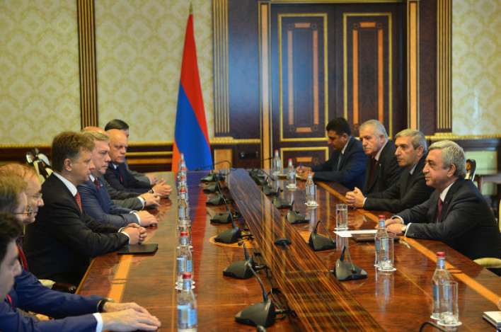 Նախագահ Սերժ Սարգսյանն այսօր ընդունել է Հայ-ռուսական միջկառավարական հանձնաժողովի համանախագահ, Ռուսաստանի Դաշնության տրանսպորտի նախարար Մաքսիմ Սոկոլովի գլխավորած պատվիրակությանը, որը Հայաստան է ժամանել Հայ-ռուսական միջտարածաշրջանային համագործակցության 5-րդ համաժողովին մասնակցելու նպատակով: