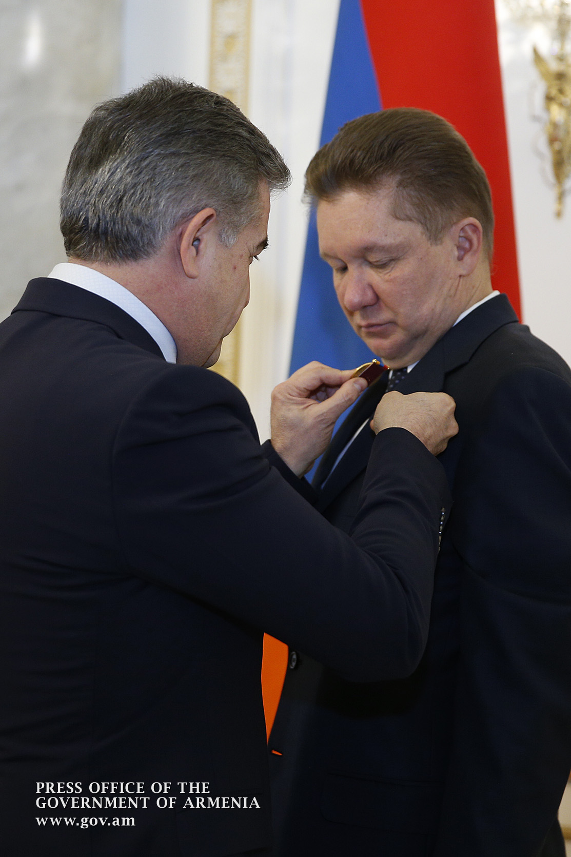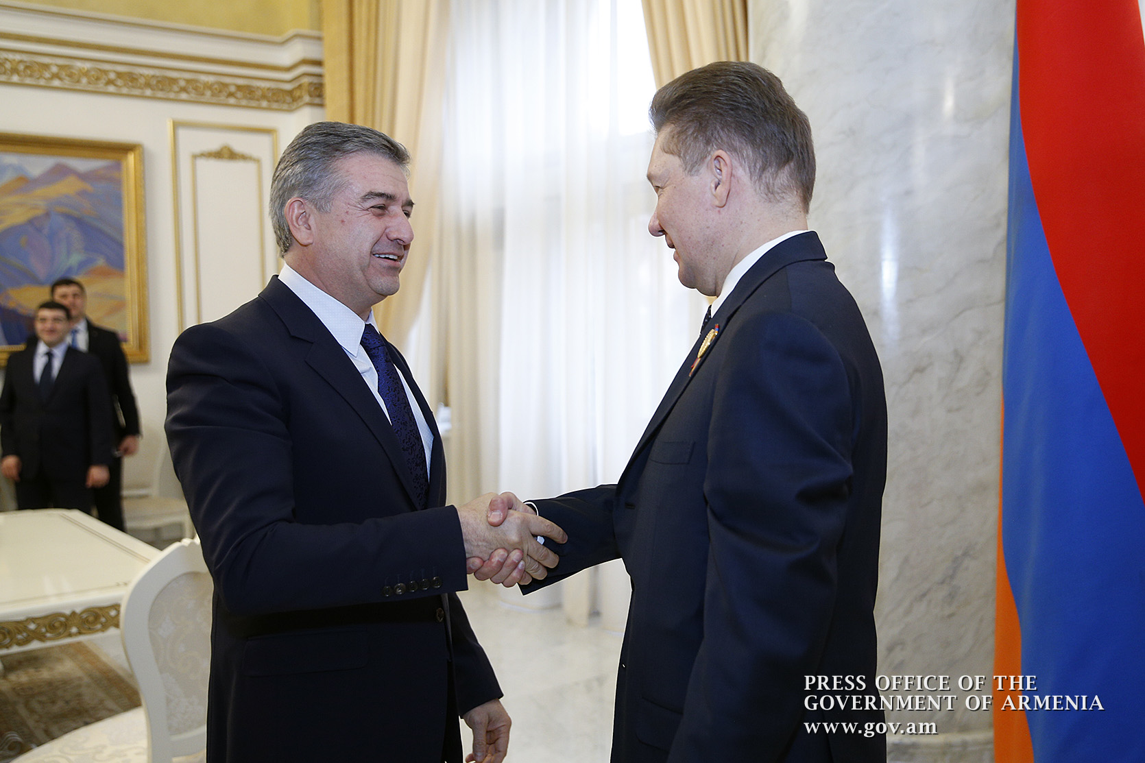 Վարչապետ Կարեն Կարապետյանն ընդունել է «Գազպրոմ» ՀԲԸ վարչության նախագահ Ալեքսեյ Միլլերին: Կողմերը քննարկել են էներգետիկայի ոլորտում հայ-ռուսական համագործակցությանը, զարգացման հեռանկարներին, ինչպես նաև Հայաստանում «Գազպրոմ» ընկերության գործունեությանը վերաբերող հարցերի լայն շրջանակ: Ինչպես տեղեկացնում են ՀՀ կառավարության տեղեկատվության և հասարակայնության հետ կապերի վարչությունից, Կարեն Կարապետյանն արդյունավետ է գնահատել «Գազպրոմ Արմենիա»-ի միջոցով մեր երկրում ոլորտի զարգացմանն ուղղված գազաէներգետիկ ծրագրերը և հատկանշել, որ «Գազպրոմ»-ը Հայաստանում ունի ամենախոշոր ներդրումային փաթեթը: Վարչապետն ավելացրել է նաև, որ երկրի էներգետիկ անվտանգությանն ուղղված ծրագրերը, հուսալի և անխափան գազամատակարարման ապահովումը, իրականացված ներդրումային խոշոր նախագծերը կյանքի են կոչվել «Գազպրոմ»-ի ղեկավարության պատրաստակամության և անմիջական ջանքերի շնորհիվ: Ալեքսեյ Միլլերը շնորհավորել է Կարեն Կարապետյանին ՀՀ վարչապետի պաշտոնում նշանակվելու կապակցությամբ և մաղթել արդյունավետ գործունեություն: Արձանագրելով ծավալած երկարատև աշխատանքի դրական արդյունքները, Ա. Միլլերն ընդգծել է, որ Հայաստանն ունի գազաֆիկացման բարձր մակարդակ՝ 96 տոկոս, գազամատակարարման հուսալի համակարգ, և վստահեցրել, որ «Գազպրոմ»-ն այսուհետ ևս պատրաստ է Հայաստանում իրականացնել ընկերության առջև դրված բոլոր խնդիրները: Նշելով «Գազպրոմ Արմենիա» ընկերության գործունեության դիվերսիֆիկացված առանձնահատկությունը՝ Ա. Միլլերը կարևորել է նաև Հրազդանի ՋէԿ-ի 5-րդ էներգաբլոկի և Աբովյանի ստորգետնյա գազապահեստ-կայանի հետագա շահագործման արդյունավետությունը: