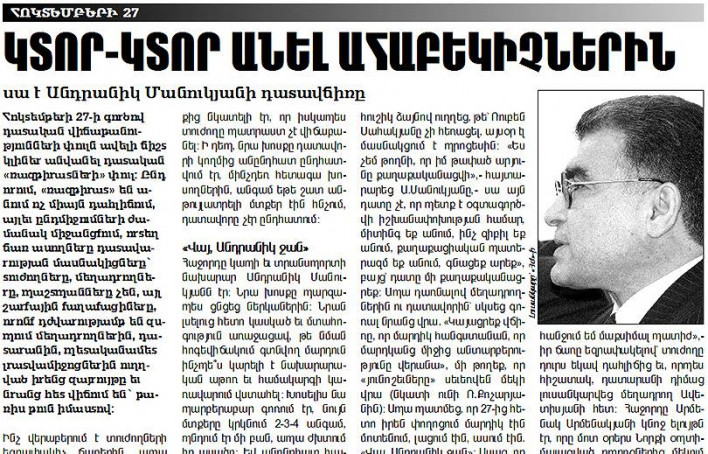 Տպագրվել է «Հայկական Ժամանակ» օրաթերթի՝ 2003 թվականի հոկտեմբերի 30-ի համարում Հոկտեմբերի 27-ի գործով դատական վիճաբանությունների փուլն ավելի ճիշտ կլիներ անվանել դատական «ռազբիրատների» փուլ: Ընդ որում, «ռազբիրատ» են անում ոչ միայն դահլիճում, այլեւ ընդմիջումների ժամանակ միջանցքում, որտեղ ճառ ասողները դատավարության մասնակիցները՝ տուժողները, մեղադրողները, պաշտպանները չեն, այլ շարքային քաղաքացիները, որոնք դժվարությամբ են զսպում մեղադրողներին, դատարանին, պետականամետ լրատվամիջոցներին ուղղված իրենց զայրույթը եւ նրանց հետ վիճում են՝ բառիս բուն իմաստով: Ինչ վերաբերում է տուժողների եզրափակիչ ճառերին, ապա դրանք էմոցիոնալ են ու իրավական առումով անգրագետ. հաճախ բանից բեխաբար ու ապակողմնորոշված մարդկանց խոսք են հիշեցնում: Նշենք, որ երեկ 91 տուժողներից դատարան էին ներկայացել ընդամենը 4-ը: Որքան էլ զարմանալի էր՝ այն ընդդիմությունը, որին իշխանությունն անընդհատ մեղադրում է դատավարությունը քաղաքականացնելու, շահարկելու մեջ, հրաժարվել էր դատական ամբիոնից, բազմաթիվ լրագրողների ներկայությամբ իր ասելիքը ներկայացնելու պատեհ առիթից: Այլ կերպ ասած՝ հրաժարվել էր շահարկելուց: Սակայն միեւնույն է՝ իշխանությունների խոսնակները, որոնք ներկայացել էին դատարան, նրանց կրկին մեղադրեցին շահարկումների մեջ: Առավոտյան դատարան էր եկել ՀԺԿ-ական Արամայիս Բարսեղյանը: Նա չնայած դժգոհեց, որ դատարանն իրեն չի ծանուցել եւ իրեն ժամանակ է պետք պատրաստվելու համար, սակայն, այնուամենայնիվ, խոսեց: Տուժողը, չգիտես ինչու, սկսեց խոսել ֆաշիստական Գերմանիայի մասին, հիշեց, որ նրան ներվել են իր արածները, քանի որ նա իր վրա վերցրեց կատարվածի պատասխանատվությունը, իսկ հայերի ցեղասպանությունը չներվեց Օսմանյան Թուրքիային, քանի որ վերջինս հրաժարվեց պատասխանատվությունը վերցնելուց: Նա փորձում էր ասել, որ ազգի, պետության դեմ կատարված հանցագործությունները եթե չեն բացահայտվում, ապա ողջ ժողովուրդը դառնում է պահանջատեր: Ա. Բարսեղյանն ասաց նաեւ, որ բավարարված չէ դատավարության ընթացքից, որ դատարանը խոչընդոտել է գործի հանգամանքների բացահայտմանը, ինքը համամիտ է մեղադրողի հետ միայն մի հարցում՝ ցմահ ազատազրկման: Բավական ցաքուցրիվ խոսքից նկատելի էր, որ իսկապես տուժողը պատրաստ չէ վիճաբանել: Ի դեպ, նրա խոսքը դատավորի կողմից անընդհատ ընդհատվում էր, մինչդեռ հետագա խոսողներին, անգամ եթե շատ անթույլատրելի մտքեր էին հնչում, դատավորը չէր ընդհատում: «Վայ, Անդրանիկ ջան» Հաջորդը կապի եւ տրանսպորտի նախարար Անդրանիկ Մանուկյանն էր: Նրա խոսքը պարզապես ցնցեց ներկաներին: Նրան լսելուց հետո կասկած եւ մտահոգություն առաջացավ, թե նման հոգեվիճակում գտնվող մարդուն ինչպե՞ս կարելի է նախարարական աթոռ եւ համակարգի կառավարում վստահել: Խոսելիս նա պարբերաբար գոռում էր, նույն մտքերը կրկնում 2-3-4 անգամ, պնդում էր մի բան, ապա ժխտում իր ասածը: Եվ անընդհատ հայտարարում էր, որ այժմ կապի նախարարը չի խոսում, այլ հոկտեմբերի 27-ին վիրավորված անձը: Խոսքը սկսեց նրանով, որ ինքը 10 օր մահացած է եղել եւ միայն Աստծո կամքով է ողջ մնացել, որ գա եւ ասի ճշմարտությունը (եռամյա դատավարության ընթացքում սա նրա երկրորդ այցն է դատարան): Իսկ ճշմարտությունն այն է, որ չի կարելի մեր «ժողովրդի վիշտն ու ամոթը վերածել կատակերգության»: «Ես շատ կարդացած մարդ եմ, գիտեմ, որ մեր պատմության մեջ միշտ նման տականքներ են եղել եւ այն, որ 14-րդ դարից սկսած մենք պետություն չունենք, նման տականքների ձեռքի գործն է»,- իր գիտելիքները ցուցադրեց տուժողը: Այս «տականքների» դատավճիռն, ըստ Անդրանիկ Մանուկյանի, կարող էին հոկտեմբերի 27-ից հետո 1-2-3, շատ-շատ՝ 6 ամսում արձակել, այն ժամանակ մեր պետությու