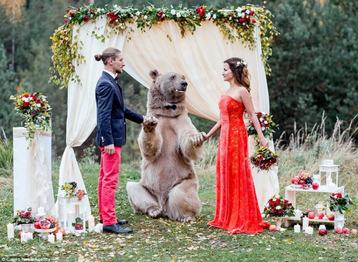 Մոսկվայում բնակվող Դենիսն ու Նեյլան Ստեփան անունով հսկա գորշ արջին վարձել են, որպեսզի կատարի մատանի բերողի պարտականությունները: Արջին նույնիսկ սև փողկապ են հագցրել: