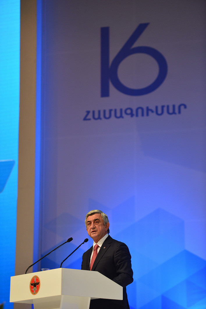 Հայաստանը միջազգային հարաբերություններում հանդես է գալիս որպես պատասխանատու, հավասարակշռված, կանխատեսելի և վստահելի երկիր: Այս մասին ՀՀԿ 16-րդ համագումարում հայտարարեց ՀՀԿ նախագահ Սերժ Սարգսյանը: «Այսպես է մեր երկիրը ներկայանում աշխարհին` կառուցողական դիրքորոշումներով, գործընկերների հետ փոխշահավետ լուծումներ գտնելով, միջազգային հանձնառությունները բծախնդրորեն կատարելով, պայմանավորվածությունները հարգելով և հաստատակամ՝ մեզ համար սկզբունքային հարցերում: Սա արտաքին հարաբերություններում մեր ընտրած ուղին է, մեր երկրի դիվանագիտության այցեքարտը: Միջպետական հարաբերություններում երկրի շուրջ նման օրակարգ ձևավորելը պահանջում է նպատակաուղղված և հետևողական աշխատանք։ Կարծում եմ, որ շատ ավելի ջանք է պահանջում այն պահպանելն ու ամրապնդելը: Մանավանդ բոլոր այն դժվարությունների ու մարտահրավերների պայմաններում, որոնք այսօր ցնցում են մեր տարածաշրջանը և ողջ աշխարհը: Մեր արտաքին քաղաքականության նպատակն ու միջազգային հարաբերություններում մեր ներգրավվածության բանաձևը մեր գործընկերների հետ հարաբերությունների զարգացումն ու խորացումն է, աշխարհում Հայաստանի բարեկամների թվի ավելացումը։ Ռուսաստանի Դաշնությունը Հայաստանի Հանրապետության դաշնակիցն է: Դրանով շատ բան է ասված մեր հարաբերությունների խորության, բազմազանության ու նշանակության առումով: Ամերիկյան նոր վարչակարգի օրոք աշխատելու ենք նոր խթան հաղորդել Միացյալ Նահանգների հետ մեր բարեկամական գործընկերությանը: Շարունակելու ենք զարգացնել հարաբերությունները Ֆրանսիայի, Գերմանիայի, Հունաստանի, եվրոպական այլ երկրների հետ՝ հիմնվելով մեր ընդհանուր քաղաքակրթական արժեհամակարգի վրա։ Ուրախությամբ ենք արձանագրում Չինաստանի հետ վերելք ապրող մեր հարաբերությունների փաստը՝ մի բան, որ հաստատապես շարունակելու ենք նույն ոգով։ Եվրասիական տնտեսական միությանը Հայաստանի անդամակցությամբ առավել լայն հնարավորություններ բացվեցին մեր երկրի տնտեսական զարգացման համար: Այդ առումով մենք պետք է լիարժեքորեն օգտագործենք այս ներուժը։ Մենք խորացնում ենք փոխգործակցությունը Եվրոպական միության հետ։ Հուսով ենք, որ շուտով հաջողությամբ կավարտենք բանակցությունները Եվրամիության հետ մեր հարաբերությունների նոր իրավական շրջանակի շուրջ»,-հայտարարեց նա: